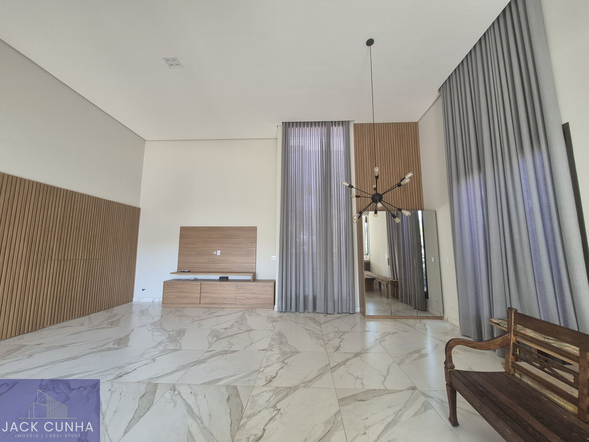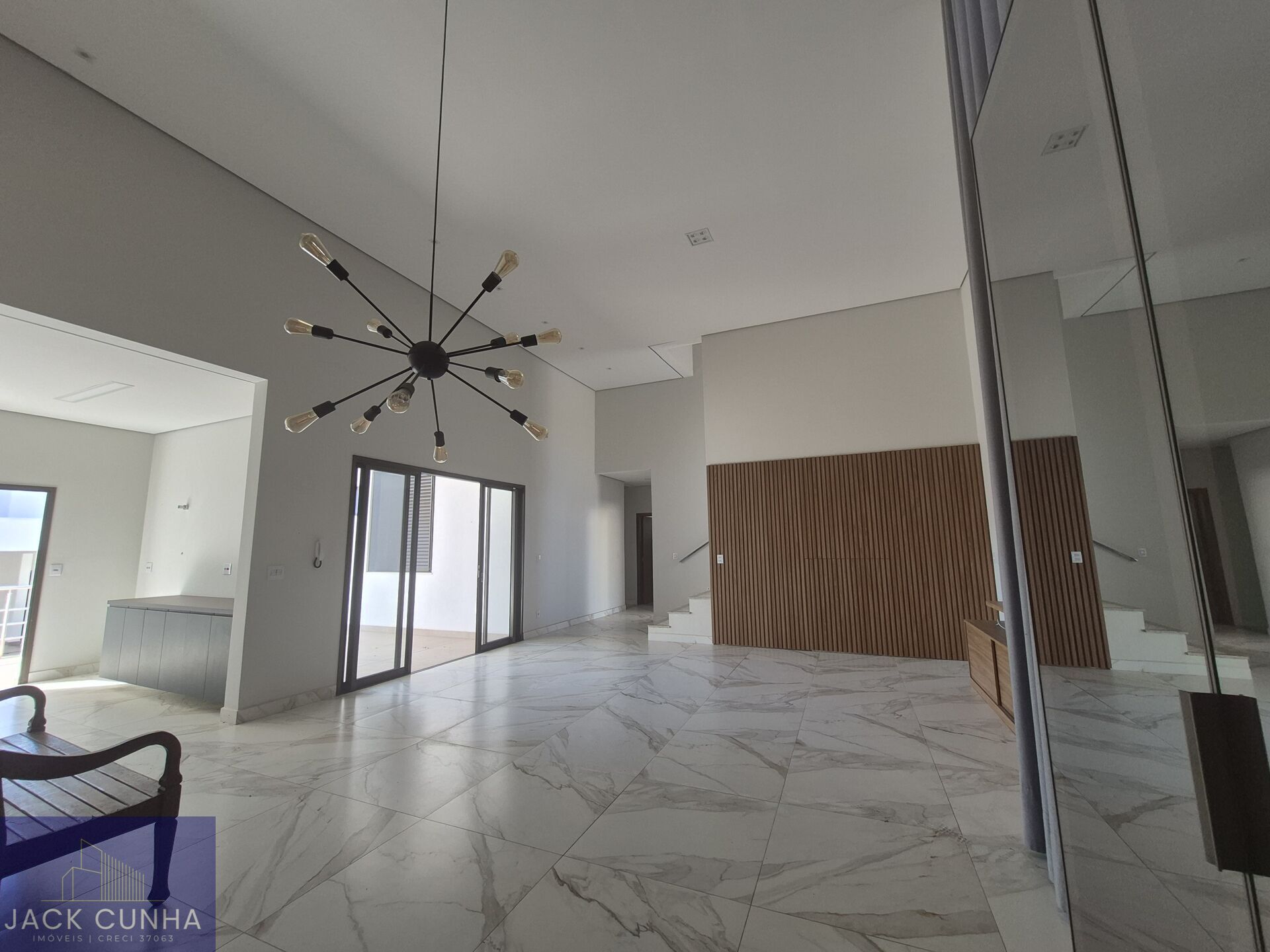 Entrada imponente com jardim; ampla sala para 02 ambientes com pé direito alto,bela cristaleira de vidro, lustre moderno, painel de madeira e cortina de linho; Cozinha com conceito aberto, bancada em granito, armários planejados; banheiro social com ninho, cuba alta, box ,armários na bancada e espelho; 4 dormitórios todos com armários, sendo 01suíte com ar condicionado, 01 master com closet, ar condicionado e varanda com vista para a lagoa do condomínio; Lavanderia. Porão com espaço que dá para montar uma bela academia; quintal com pomar.